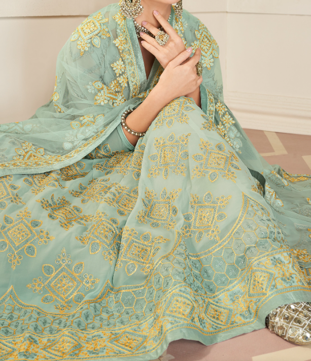 Faux Georgette Light Mehendi Heavy Embroiderd Thread, Zari and Diamond Work Salwar Kameez